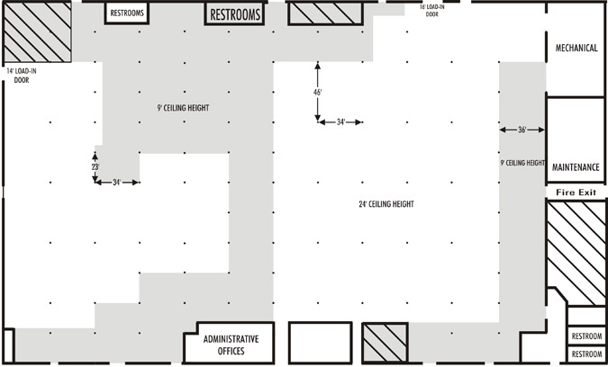 Overhead lighting throughout the facility is provided by strip fluorescent and metal halide fixtures. Theatrical stage lighting is also available.